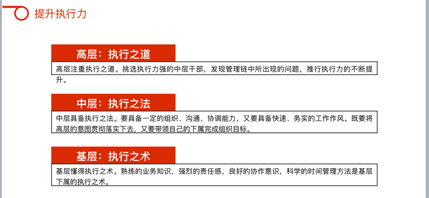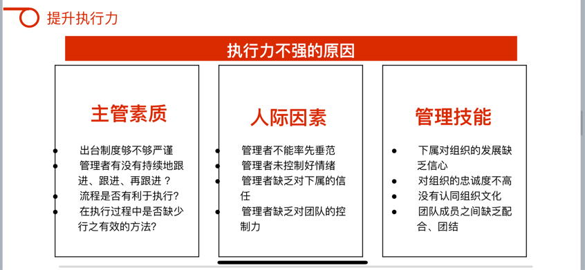 生動(dòng)形象地幫助大家建立了對(duì)執(zhí)行力的結(jié)構(gòu)化認(rèn)知,更進(jìn)一步理解到了工作態(tài)度、工作職責(zé)、工作任務(wù)、工作結(jié)果的邏輯聯(lián)系,以及如何在強(qiáng)化執(zhí)行力的同時(shí),提高部門(mén)運(yùn)作效率,使效能與效率相輔相成,創(chuàng)造出更高的部門(mén)績(jī)效。